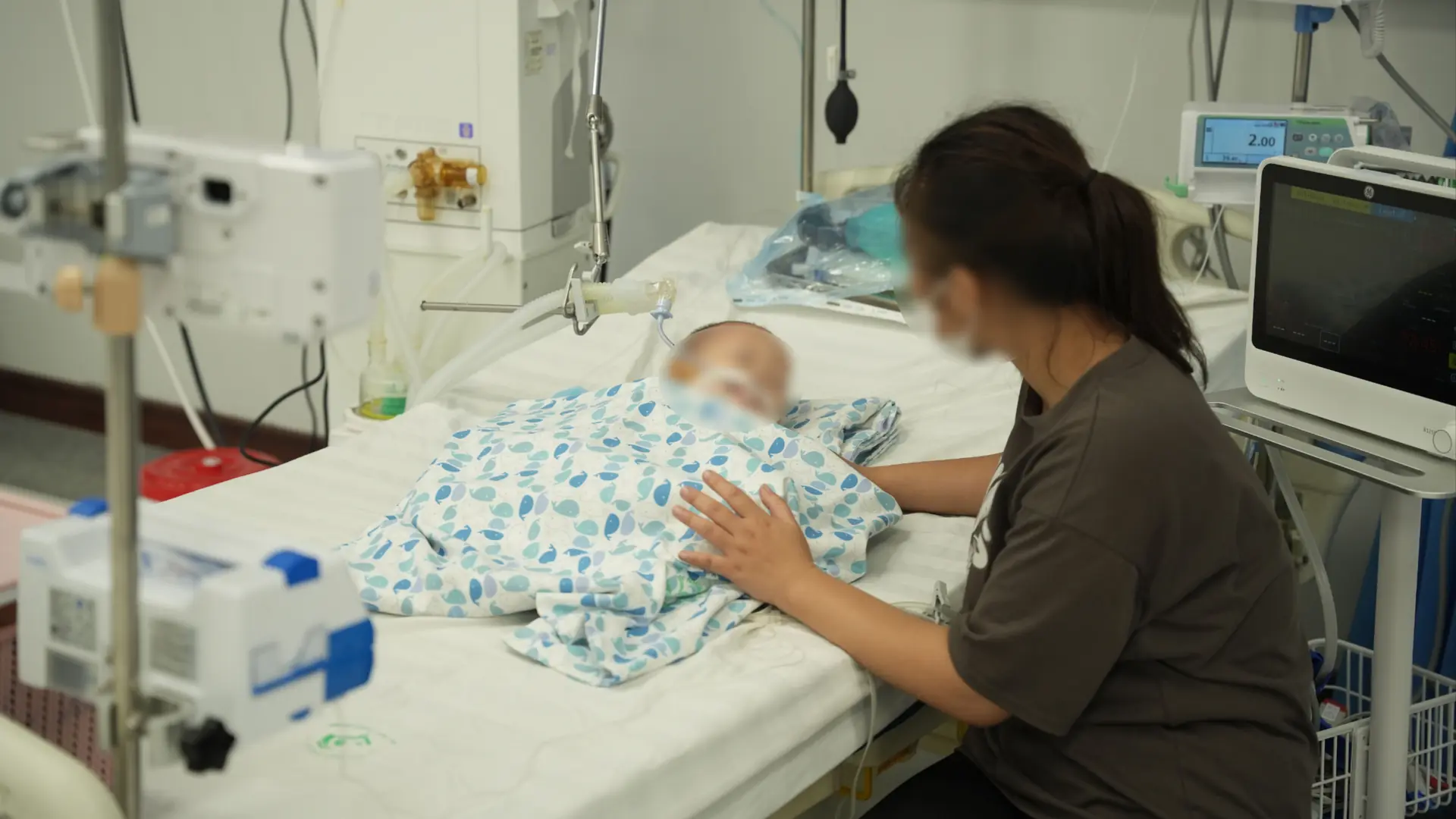 Tình trạng của bệnh nhi diễn tiến nhanh và nghiêm trọng, tổn thương phổi rất xấu và lan tỏa cả hai bên, trẻ co giật nhiều lần, sốt và suy hô hấp kéo dài. Mặc dù bệnh nhi được thở máy kiểm soát hô hấp, hỗ trợ tuần hoàn và thần kinh, đảm bảo các chỉ số sinh tồn như mạch, huyết áp, nhịp thở, SPO2, co giật đã được kiểm soát tốt, tuy nhiên, bệnh vẫn còn rất nặng. Tổn thương phổi có nguy cơ diễn biến xấu trong 48-72 giờ tới.