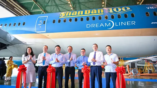 Lần đầu tiên, hình ảnh logo Báo Nhân Dân, một cơ quan báo chí được gắn trên thân tàu bay của Vietnam Airlines, cùng con số “100” sẽ xuất hiện trên thân chiếc máy bay Boeing 787-9 mang số hiệu VN-A8671 - một trong những dòng tàu bay hiện đại và tầm xa nhất của Vietnam Airlines, thường được khai thác trên các chặng bay quốc tế trọng điểm.