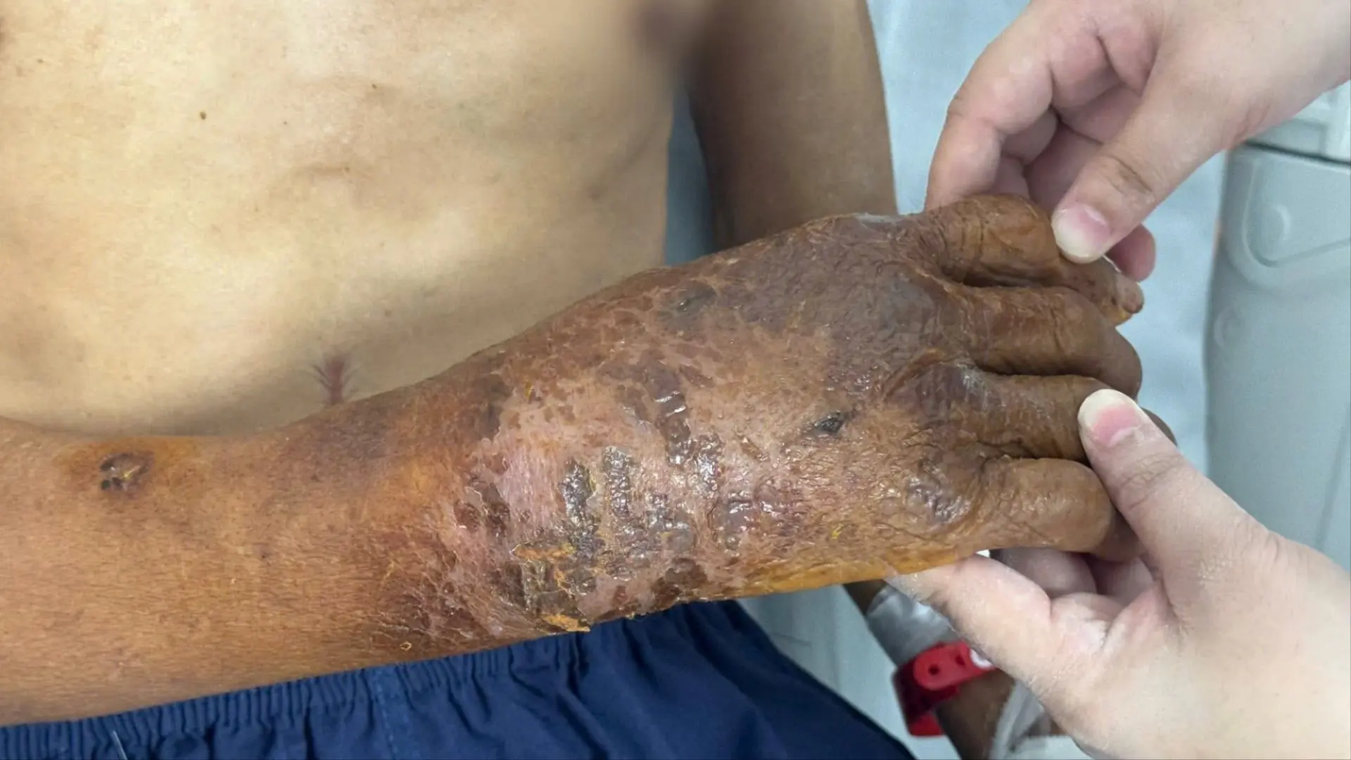 Trước đó, bệnh nhân gặp tai nạn lao động gây tổn thương nặng vùng tay phải, nhưng không tiêm phòng uốn ván sau chấn thương - yếu tố nguy cơ nghiêm trọng dẫn đến biến chứng nặng sau này. Chỉ vài ngày sau tai nạn, tay phải sưng nóng, đỏ, đau dữ dội, phù nề, nổi phồng, rỉ dịch mủ hôi, kích thước gần gấp đôi tay còn lại. Bệnh nhân sốt cao liên tục, suy kiệt, đau nhức toàn thân.