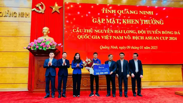 Cụ thể, ngày 9/1, tỉnh Quảng Ninh đã tổ chức buổi gặp mặt và khen thưởng Nguyễn Hai Long đã có màn trình diễn xuất sắc cùng đội tuyển Việt Nam. Tại lễ biểu dương, tiền vệ Hai Long được tỉnh Quảng Ninh tặng bằng khen và thưởng 350 triệu đồng do có thành tích xuất sắc đạt Huy chương Vàng tại ASEAN Cup 2024.